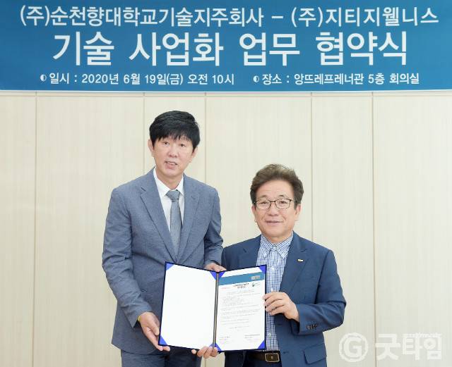 [굿타임] = 이강부 기자 = 순천향대학교는 교내 앙뜨레프레너관에 위치한 산학협력단 회의실에서 ㈜순천향대학교 기술지주회사와 ㈜지티지웰니스 간에 양 기관의 발전을 위한 기술지원과 산업체 공동연구를 포함한 기술사업화 업무 협약을 체결했다.