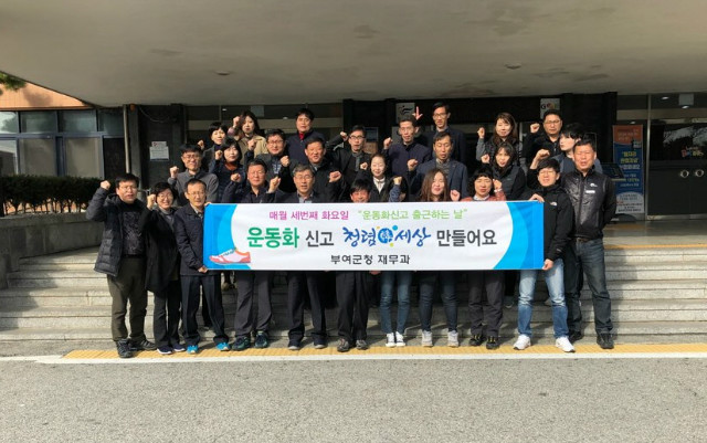 [굿타임] = 이강부 기자 = 부여군 재무과는 자율적 청렴실천 분위기 확산을 위한 1부서 1청렴 시책으로 지난 20일 직원들이 운동화를 신고 출근했다.