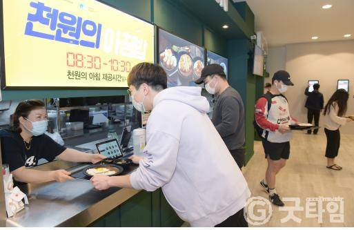 이 기간에 학생들은 1식 4000원 상당의 아침식사를 1000원에 이용할 수 있으며 교내 학생회관과 향설생활 2관의 푸드코트와 야외 그라찌에 카페와 생활 1관 등 총7개 코너에서 제공하는 1000원의 아침밥은 학생들의 접근성을 높이고 아산지역에서 생산된 농산물을 주재료로 사용해 별도의 신메뉴를 개발해 제공하고 있다.