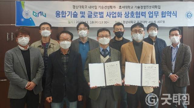 협약식은 경상대에서 진행됐으며 호서대 기술경영전문대학원 이종원 원장, 박승범 사업단장, 정희운 학과장과 경상대 전정환 기술경영 학과장, 김영철 기획부처장, 전차수 교수를 비롯한 관계자가 참석했다.