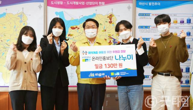 한편 순천향대학교 온라인 홍보단 나누미는 지난 2018년부터 3년째 아산시를 통해 취약계층 아동들에게 성금을 전달하고 있다.