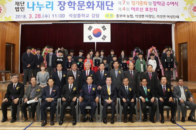 [굿타임] = 이강부 기자 = 재단법인 나누리장학문화재단은 석성중학교 강당에서 제7회 정기총회를 열고 장학금 전달과 관내 어르신 1000여명을 초대해 어르신 효잔치를 개최했다.