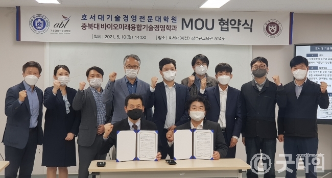 [굿타임] = 이강부 기자 = 호서대학교 기술경영전문대학원이 충북대학교 바이오미래융합기술경영학과와 산업현장의 요구와 글로벌 트렌드에 능동적으로 대응할 수 있는 실무능력과 전문성을 겸비한 융합기술사업화분야의 고급인력 양성을 위해 업무협약(MOU)을 체결했다.