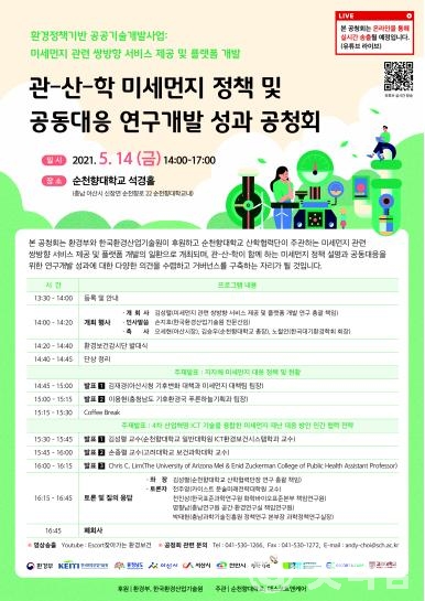 [굿타임] = 이강부 기자 = 순천향대는 오는 14일 환경부와 환경산업기술원이 후원하고 순천향대 산학협력단이 주관하는 충남 관산학 미세먼지 정책과 공동대응 연구개발 성과 공청회를 온라인으로 개최한다.