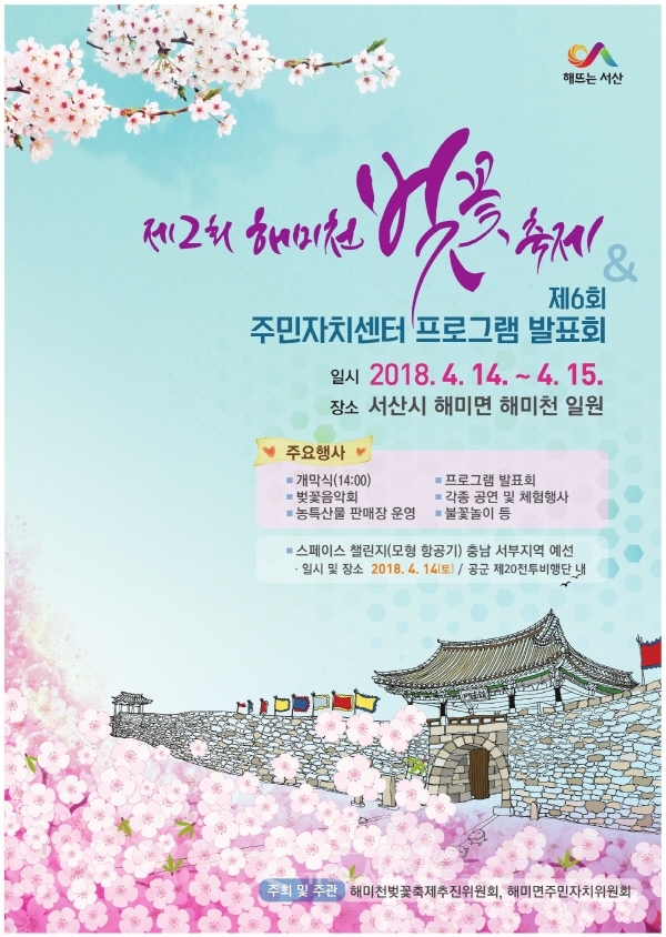 벚꽃 만개시기에 맞춰 오는 14일과 15일 양일간 해미천 일원에서 제2회 해미면벚꽃축제가 개최된다.