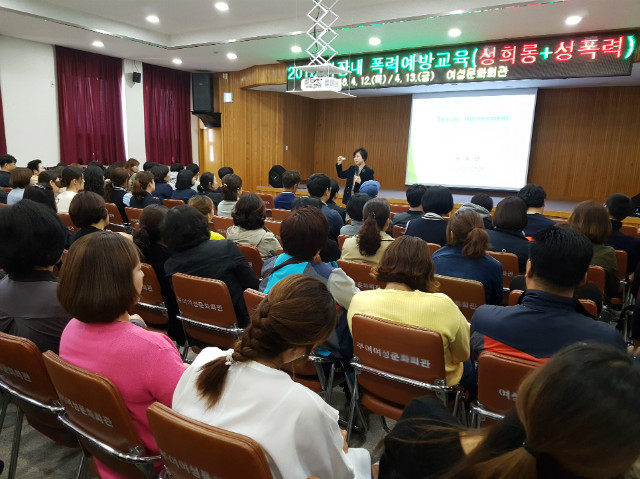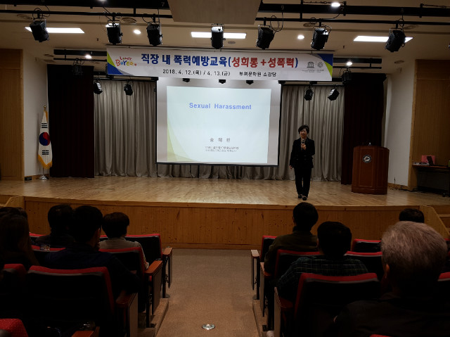 [굿타임] = 이강부 기자 = 부여군은 지난달 간부공무원의 직장 내 성희롱과 성폭력 예방교육에 이어 12일과 13일 일반직과 비정규직 950여명을 대상으로 예방교육을 실시했다.
