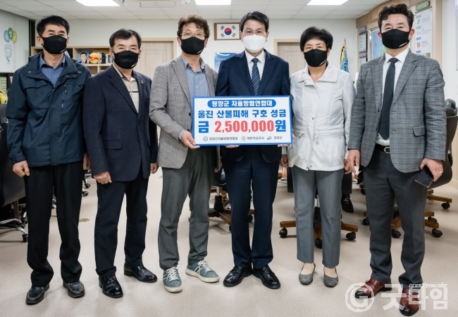 [굿타임] = 이강부 기자 = 청양군자율방범연합대는 청양군을 찾아 산불피해로 어려움을 겪는 울진지역 주민들을 돕기 위해 자율적으로 모금한 성금 250만원을 전달했다.