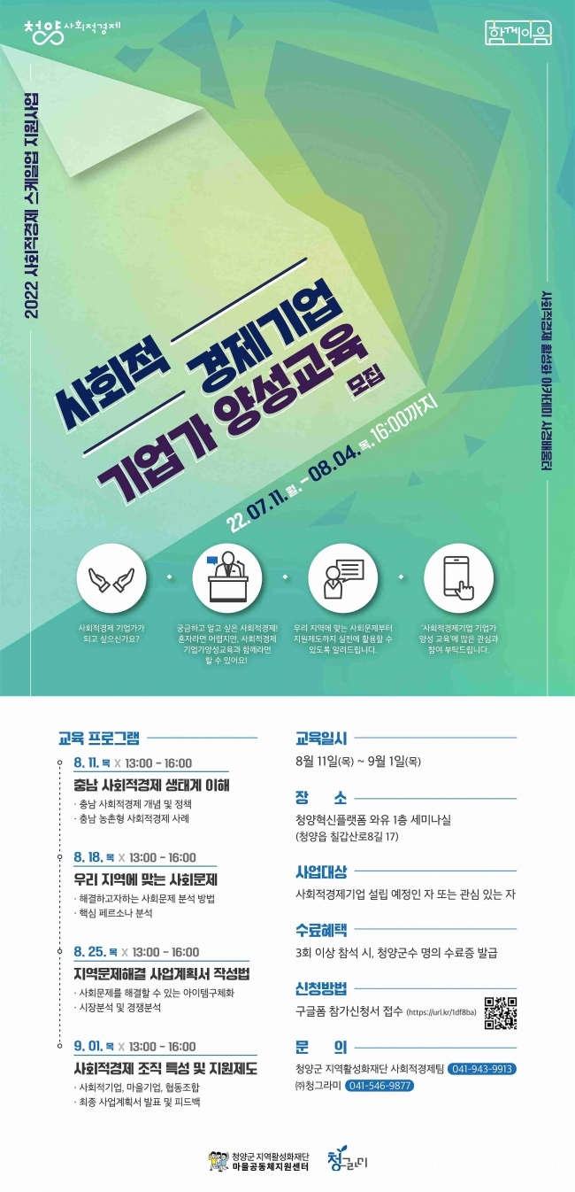 [굿타임] = 이강부 기자 = 청양군은 오는 8월4일까지 사회적경제 기업가 양성과정에 참여할 수강생을 모집한다.