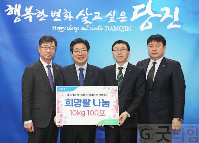 [굿타임] = 이강부 기자 = 농협중앙회 당진시지부는 6일 당진시청을 방문 어려운 이웃을 위해 써 달라며 250만원 상당의 새해맞이 희망쌀 10㎏ 100포를 기탁했다.