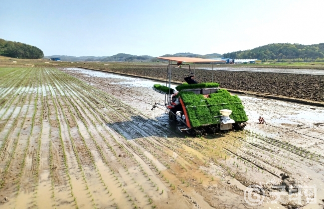 [굿타임] = 이강부 기자 = 서천군 문산면 김경태 농가에서 관내 첫 모내기를 시작했다.