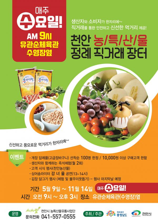 직거래 장터에 영세, 고령농 20여 농가가 참여하며 11개 부스에서 미곡, 잡곡, 과일, 채소, 가공식품, 장류 등 50여 품목을 시중가 대비 약20%저렴하게 판매하며 불량품과 수입산을 전면 배제하고 천안에서 생산된 농산물을 중심으로 친환경인증 농특산물을 판매하고 소비자와 함께하는 체험 프로그램과 이벤트, 할인행사도 진행한다.