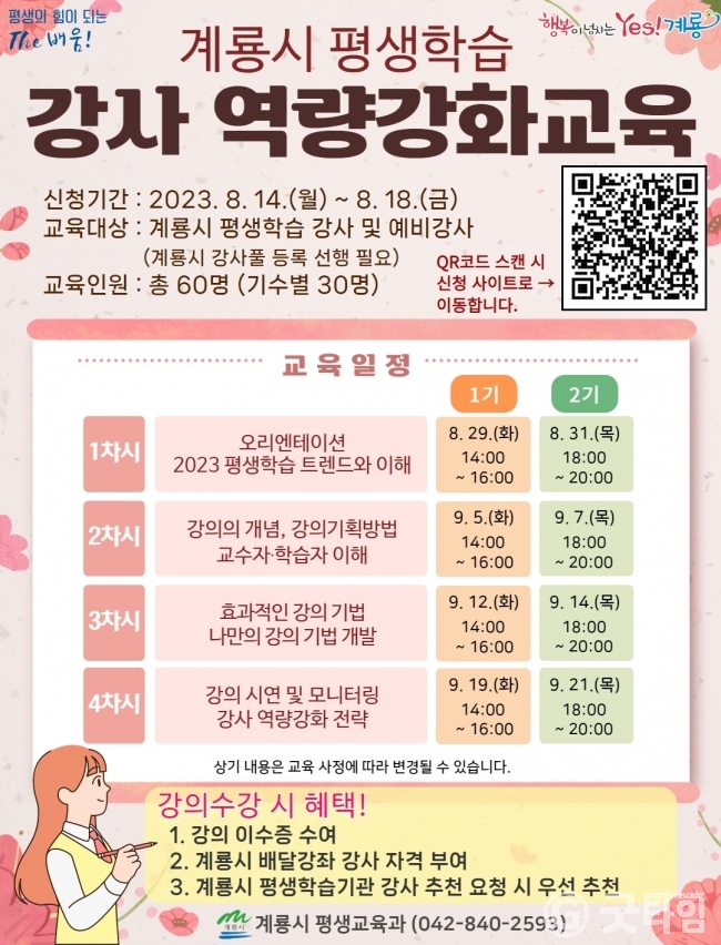 [굿타임] = 이강부 기자 = 계룡시는 오는 14일부터 18일까지 평생학습 강사역량 강화 교육 운영에 따른 강좌별 학습자를 모집한다.