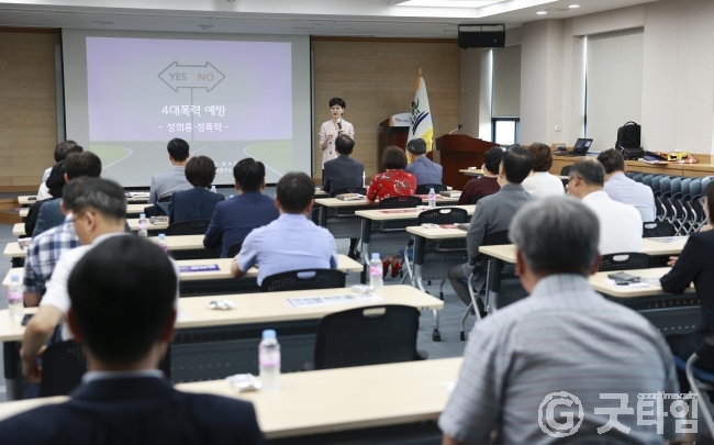 [굿타임] = 이강부 기자 = 계룡시는 시청 대회의실에서 이응우 시장을 비롯한 관리직 공무원을 대상으로 직장내 4대 폭력(성희롱, 성매매, 성폭력, 가정폭력) 예방 교육을 실시했다.