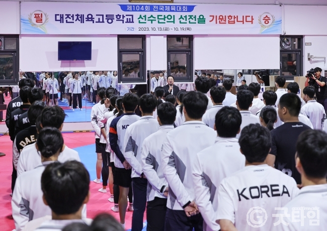 [굿타임] = 이강부 기자 = 이장우 시장은 대전체육고등학교 훈련장을 찾아 제104회 전국체육대회에 참가하는 148명의 선수단을 격려했다.