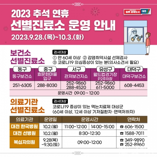 [굿타임] = 이강부 기자 = 대전시는 시민들이 감염병으로부터 안전하고 건강한 추석 연휴를 보낼수 있도록 28일부터 내달 3일까지 빈틈없는 감염병 방역체계와 응급의료 대응체계를 가동한다.