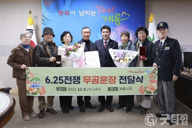 [굿타임] = 이강부 기자 = 계룡시는 시장 집무실에서 6.25전쟁 무공훈장 전달식을 열었다.