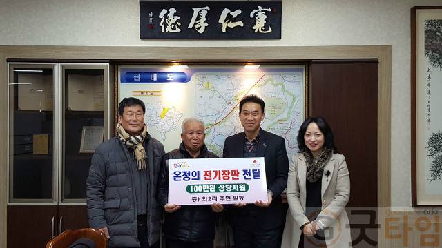 [굿타임] = 이강부 기자 = 부여군 규암면 외2리 주민일동은 지난 7일 규암면행정복지센터를 방문해 마을회 기금 중 일부를 관내 어려운 사례관리대상 가구에게 전달해 달라며 100만원 상당의 전기장판을 전달했다.