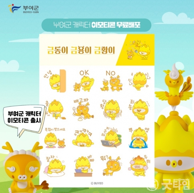 [굿타임] = 이강부 기자 = 부여군은 신규 프렌즈 캐릭터 금동이, 금용이, 금황이를 활용한 이모티콘을 7일부터 무료로 배포한다.