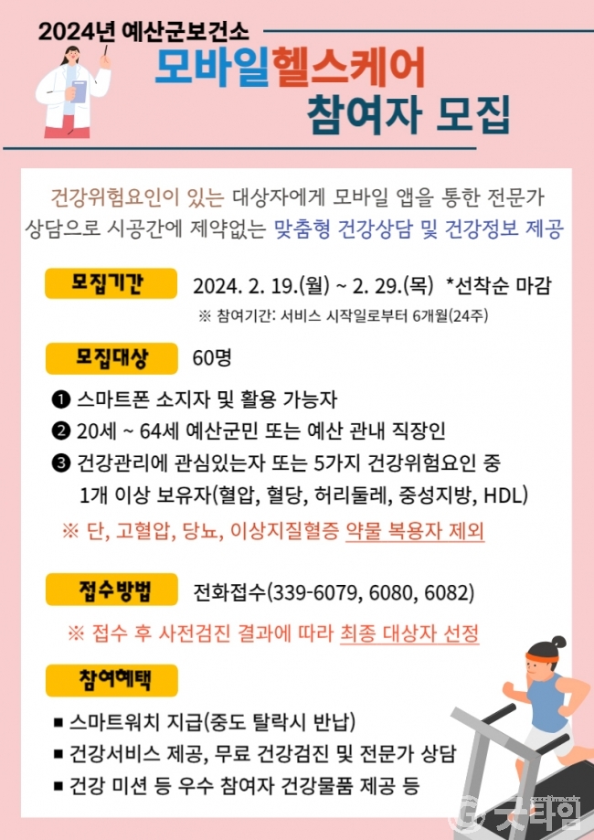 [굿타임] = 이강부 기자 = 예산군보건소는 오는 19일부터 2024년 모바일헬스케어 사업 참여자 60명을 선착순 모집한다.