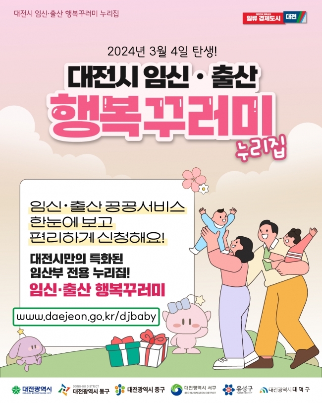 대전시 임신과 출산 행복꾸러미 누리집은 임신과 출산 전용 온라인 통합서비스로 정부와 대전시에서 지원하는 다양한 임신과 출산 관련 공공서비스를 한눈에 볼수 있으며 신청링크 함께 제공하며 누리집은 웹 뿐만아니라 모바일에서 만날수 있다.