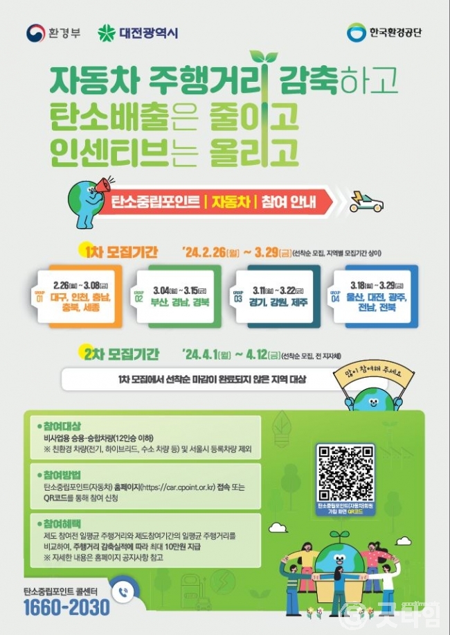 [굿타임] = 이강부 기자 = 대전시는 자동차 주행거리 감축실적에 따라 인센티브를 지급하는 2024년 탄소중립포인트 자동차 분야 참여자 5207명을 선착순으로 모집한다.