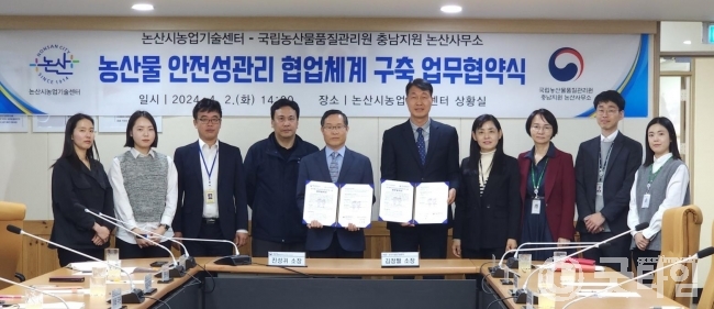 [굿타임] = 이강부 기자 = 논산시와 국립농산물품질관리원 충남지원 논산사무소는 논산시농업기술센터에서 논산시 농업 발전을 위해 농산물 안전성관리 협업체계 구축을 위한 업무협약을 체결했다.