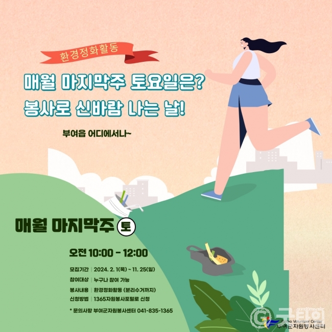 [굿타임] = 이강부 기자 = 부여군자원봉사센터는 일상생활속 자원봉사 참여를 위해 매월 마지막주 토요일을 정기적 환경정화 자원봉사활동의 날로 지정해 운영한다.