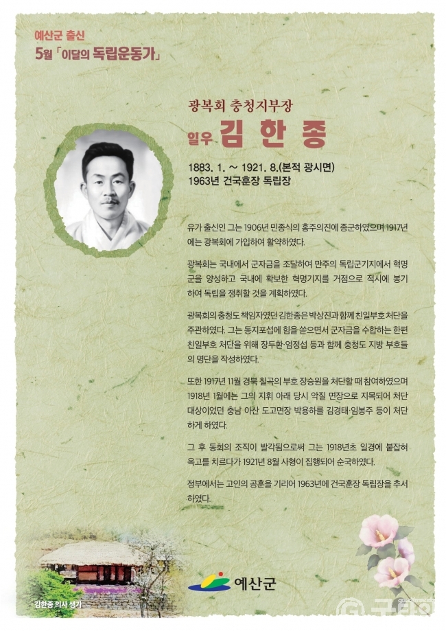 [굿타임] = 이강부 기자 = 예산군은 나라의 독립을 위해 희생한 독립운동가를 널리 알리기 위한 5월의 독립운동가로 일우 김한종 선생을 선정했다.
