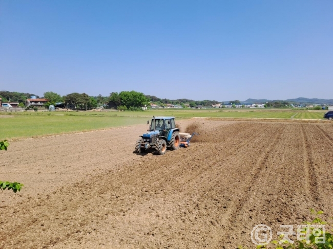 [굿타임] = 이강부 기자 = 부여군 세도면 귀덕2리 표희윤 농가는 청송리 963-5 등 4필지 약1만1000㎡에 벼 건답직파를 실시했다.