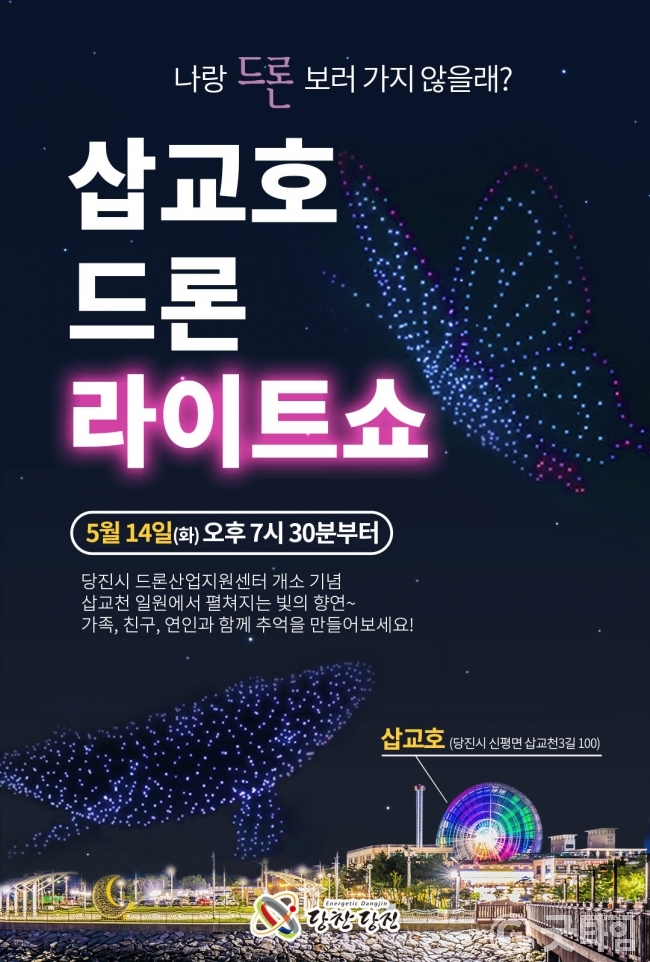 당찬 당진 드론 라이트쇼는 삽교호관광지 바다공원 특설무대에서 펼쳐지며 수많은 드론이 밤하늘을 수놓을 예정이다.