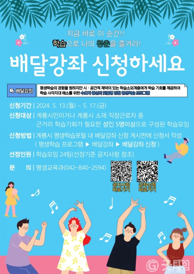 [굿타임] = 이강부 기자 = 계룡시는 오는 13일부터 17일까지 2024년 누구나 배달강좌 학습모임을 모집한다.