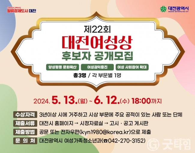 [굿타임] = 이강부 기자 = 대전시는 오는 13일부터 6월12일까지 제22회 대전여성상 수상자 추천을 공모한다.