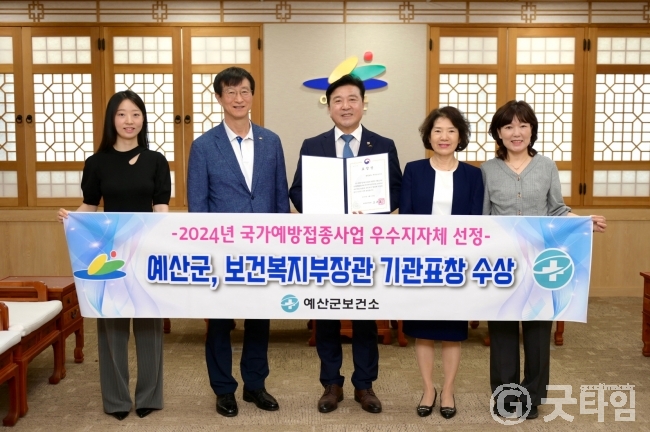 [굿타임] = 이강부 기자 = 예산군보건소는 국민이 예방접종에 적극 참여하는데 기여하는 등 국가예방접종사업을 성공적으로 수행하고 추진한 공로를 인정받아 예방접종사업 우수보건소로 선정돼 보건복지부 장관 표창을 수상했다.
