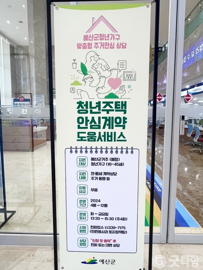 [굿타임] = 이강부 기자 = 예산군은 군에 거주커나 거주할 예정인 청년을 대상으로 청년 주택 안심계약 도움 서비스를 4월부터 시행하고 있다.