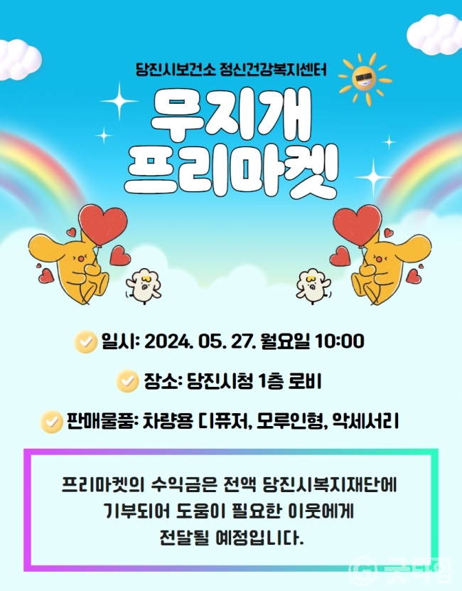 [굿타임] = 이강부 기자 = 당진시보건소는 오는 27일 당진시청 1층에서 정신질환자 자립을 위한 사회적응 훈련 무지개 프리마켓을 개최한다.