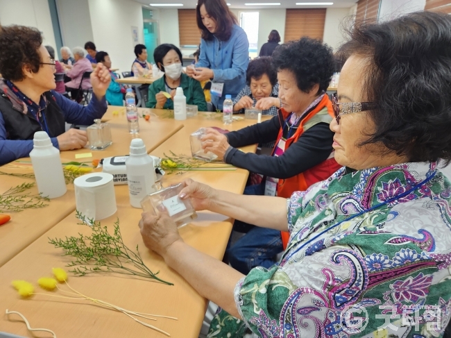 지난달 11일부터 이달 2일까지 진행된 아로마테라피에서는 힐링아로마 손마사지, 천연 아로마 비누 만들기, 만능 통증 크림 만들기, 향기로운 꽃 디퓨져 만들기를 진행해 어르신들께 향기로운 생활용품을 직접 만들어 성취감과 재미를 선물했다.