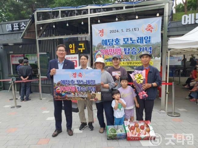 [굿타임] = 이강부 기자 = 예산군의 대표적 체험형 관광명소로 자리매김한 예당호 모노레일 이용객 수가 개장일 이후 594일만인 지난 24일 50만명을 돌파했다.