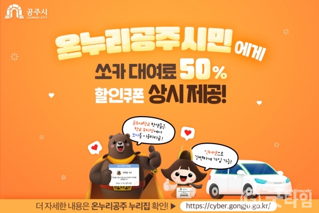 이번 협약에 따라 공주시 관내 쏘카존에서 온누리공주 시민을 대상으로 대여 요금을 50% 할인받을수 있는 쿠폰을 제공키로 했다.