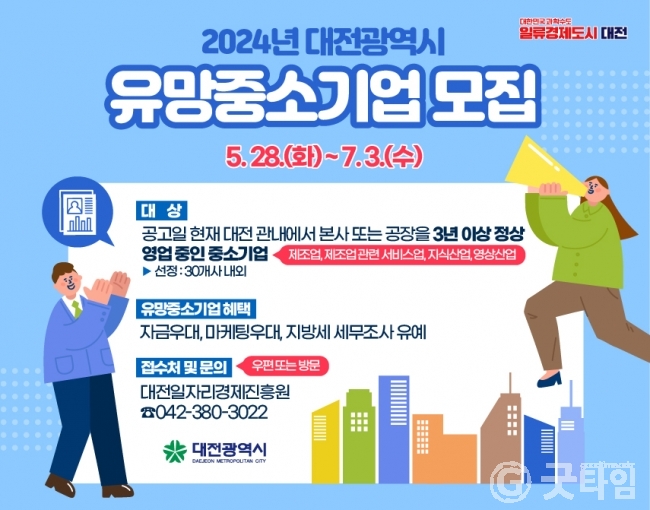 [굿타임] = 이강부 기자 = 대전시는 성장 잠재력이 높은 지역 중소기업을 집중적으로 지원키 위해 2024년 대전시 유망중소기업을 모집한다.