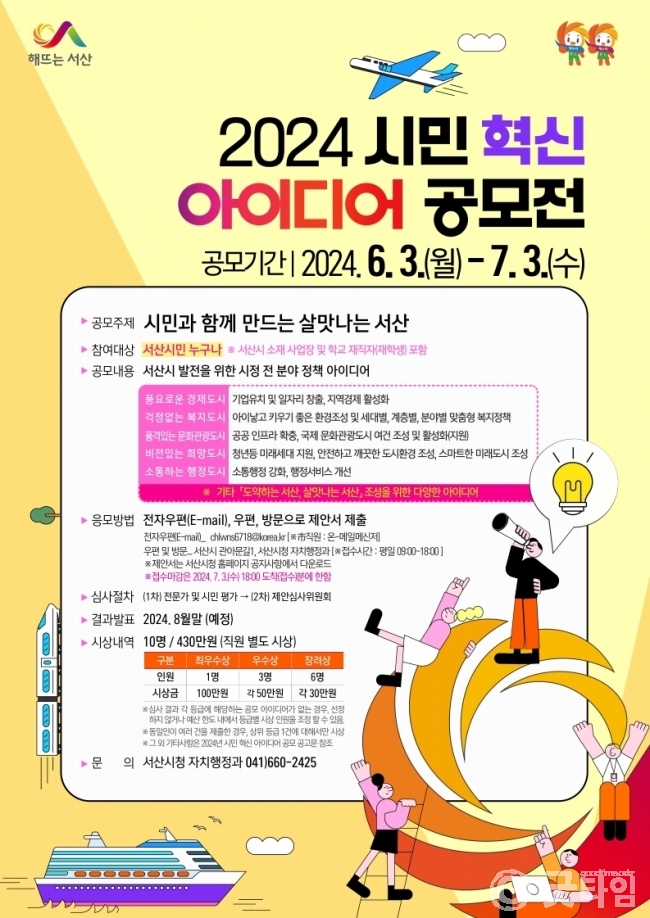 [굿타임] = 이강부 기자 = 서산시는 시민과 함께 만드는 살맛나는 서산을 주제로 소통과 참여행정 실현을 위해 2024년 시민 혁신 아이디어 공모전을 개최한다.