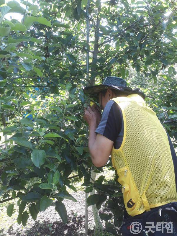 [굿타임] = 이강부 기자 = 예산군농업기술센터는 40개 사과농가에 대해 기상변화에 따라 달라지는 병해충 발생상황을 2주 간격으로 정밀예찰하고 적기방제토록 현장중심 활동을 강화하고 있다.