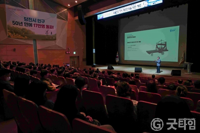 [굿타임] = 이강부 기자 = 당진시는 시청 대강당에서 국제e-모빌리티엑스포 김대환 이사장을 특별강사로 초청해 E-Mobility 수출전진기지 대한민국을 위한 제언이란 주제로 특강을 진행했다.