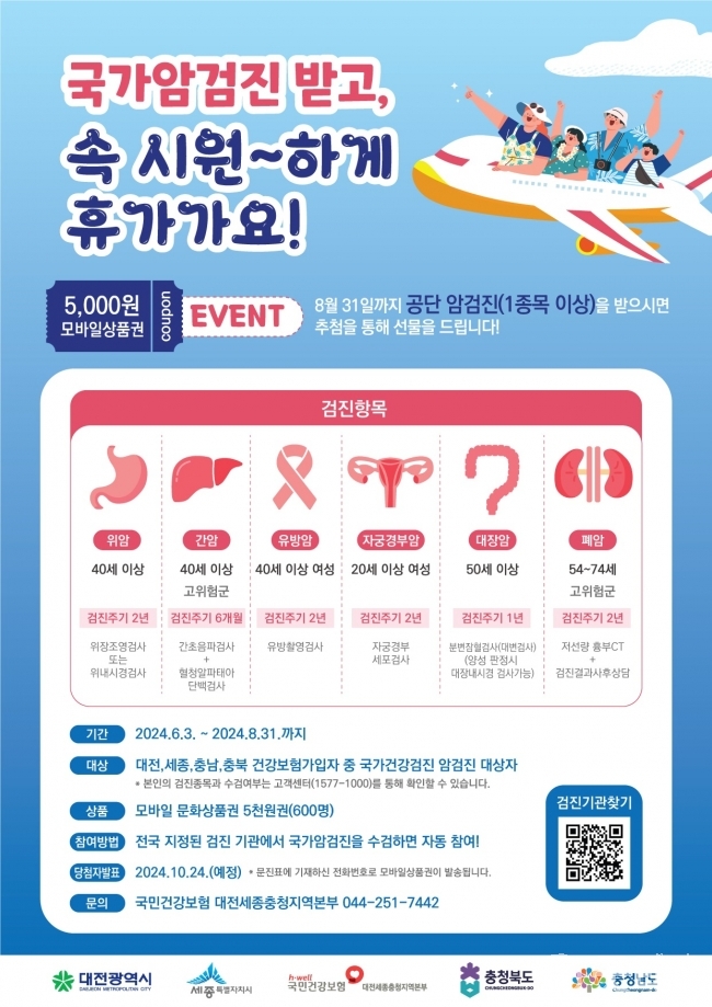 국가암검진 항목은 위암, 간암, 대장암, 유방암, 자궁경부암, 폐암으로 6개 항목중 1가지 이상만 실시해도 이번 이벤트에 참여할수 있으며 당첨자 발표는 올해 10월 예정으로 문진표에 기재한 전화번호로 모바일상품권이 발송된다.
