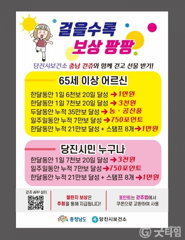 [굿타임] = 이강부 기자 = 당진시보건소는 6월을 맞아 1530 걷기실천(1주일에 5일 이상 30분 걷기) 인구를 늘리기 위해 걷쥬 앱 챌린지 목표 걸음수를 낮췄다.