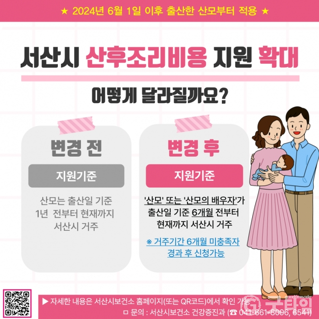 [굿타임] = 이강부 기자 = 서산시는 지난해 8월부터 시행한 출산가정 산후조리비용 지원 사업의 기준요건을 완화해 6월부터 확대 시행한다.