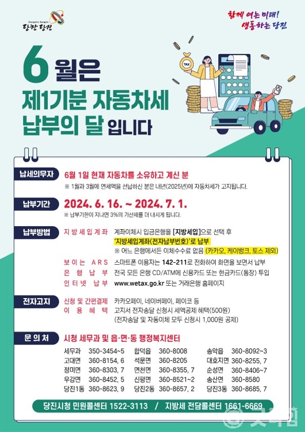 [굿타임] = 이강부 기자 = 당진시는 2024년 제1기분 자동차세 7만813건, 69억원을 과세했다.