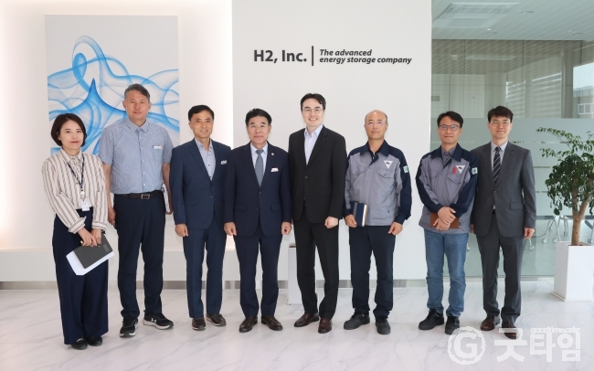 방문한 ㈜에이치투는 바나듐 흐름전지를 이용한 에너지저장장치(ESS)를 생산하는 기업으로 해외에서 기술력을 인정받아 독일에 제품을 수출하고 있으며 지난해 6월 5173㎡의 부지에 건축 면적 4880㎡의 공장을 준공하고 대전에서 이전했다.