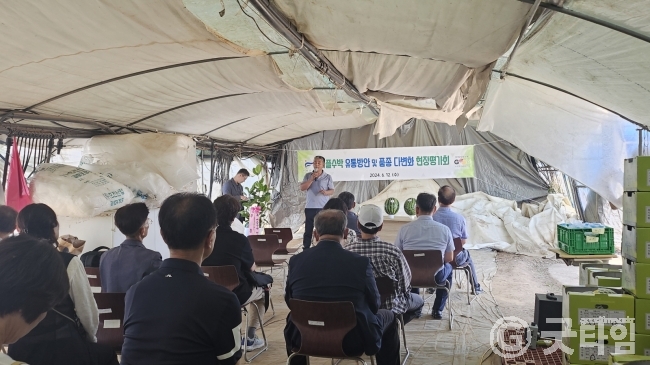 [굿타임] = 이강부 기자 = 부여군농업기술센터는 세도면 귀덕리 임희윤 농가에서 사업관계자, 농업인 등 40여명이 참석한 가운데 애플수박 유통방안과 품종 다변화 현장평가회를 개최했다.