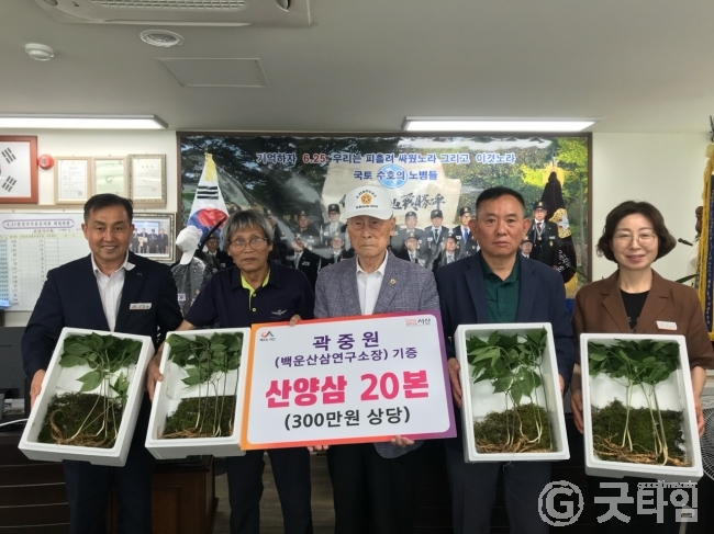 [굿타임] = 이강부 기자 = 서산시 백운산삼연구소 곽중원 소장이 호국보훈의 달을 맞아 6.25 참전유공자회 서산시지회에 300만원 상당의 산양삼 20본을 기탁했다.