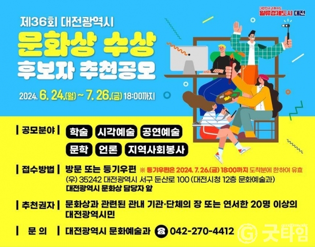 [굿타임] = 이강부 기자 = 대전시는 문화예술 창달과 지역사회봉사에 기여한 공로가 현저한 시민을 대상으로 24일부터 7월26일까지 대전광역시 문화상 후보자를 공모한다.